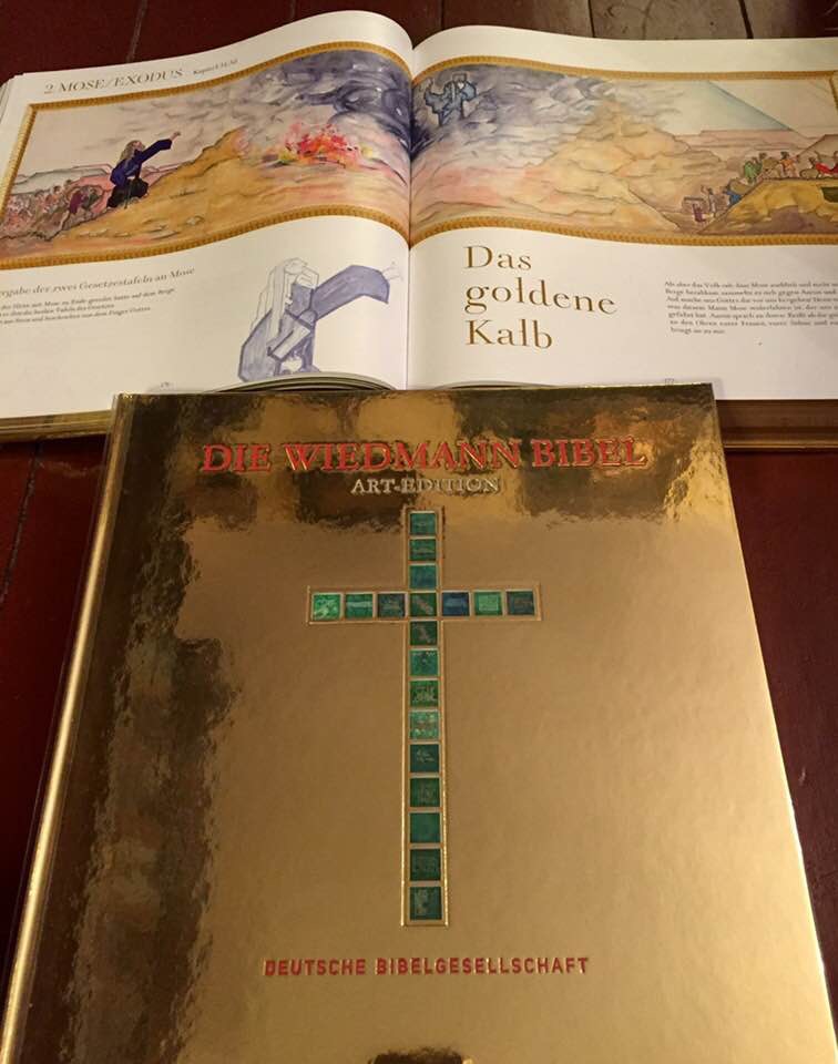 „Wiedmann Bibel ist weltweit die einzige ihrer Art, die das komplette Alte und Neue Testament in Bildern zeigt. Im Original sind die 3.333 von Hand gemalten Blätter in 19 Leporellos zusammengefasst und ergeben eine Gesamtlänge von mehr als einem Kilometer.