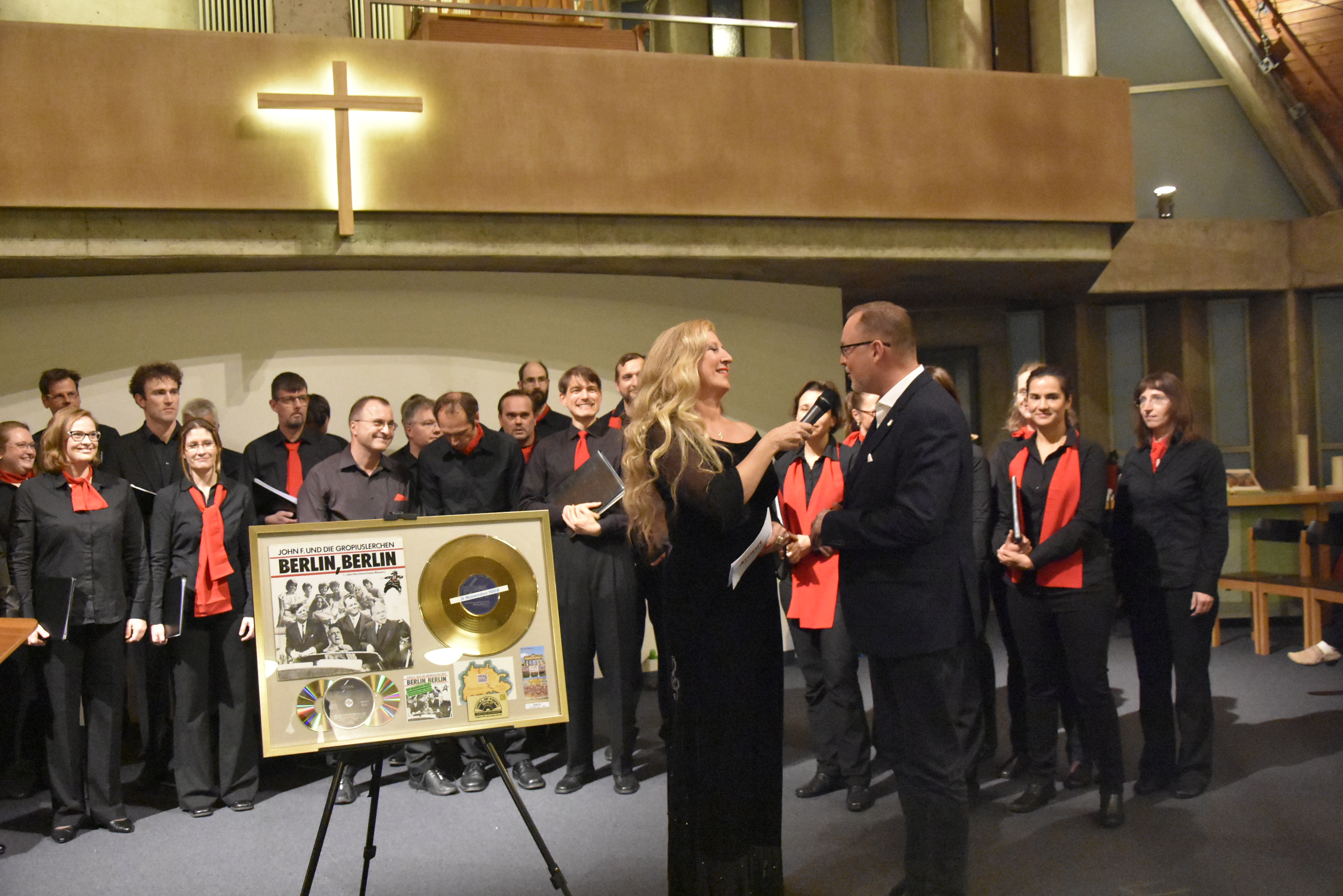 Vor 30 Jahren schlug der Song der Gropiuslerchen mit „Berlin, Berlin dein Herz kennt keine Mauern…“ alle Rekorde in der deutschen Musikwelt und steht wie kein anderer mit an der Spitze für die Erinnerung zum Mauerfall in Deutschland. Das zu würdigen und auch die Erinnerung an dieses historische Ereignis aufrecht zu erhalten, war der Anlass für die wohlverdiente Verleihung der goldenen Schallplatte an den Chor.