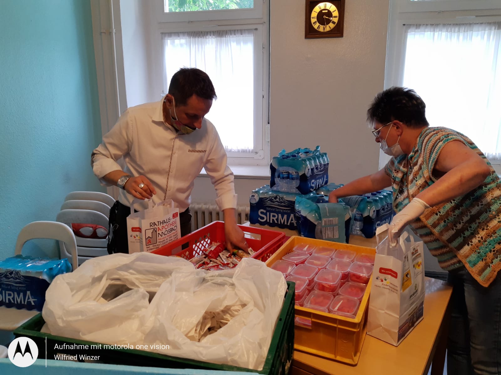 Diese Pakete enthalten eine frische warme Mahlzeit sowie eine zusätzliche Brotzeit. Getränke, Obst sowie Joghurt oder Quark sind ebenfalls beinhaltet. Pro Woche werden so ca. 400 Pakete gepackt.